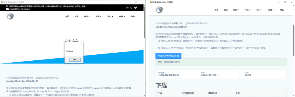 当订单处理完成并跳转后,会向您的邮箱发送最终的订单信息。并且,程序会自动获取SN,并自动完成激活,并不会需要您任何额外操作。